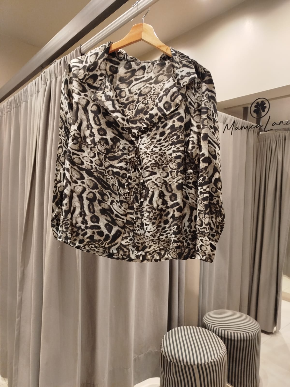 Blusa de estampa animal, de silueta suave y caída liviana. Presenta escote en V con solapas delicadas que enmarcan el cuello y un detalle de lazo frontal que permite regular el calce y aporta un gesto sutilmente femenino.