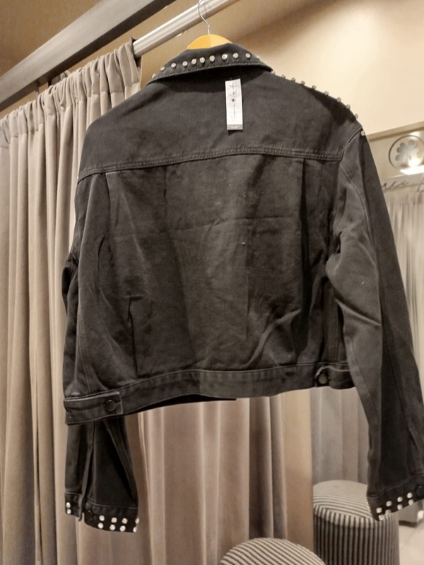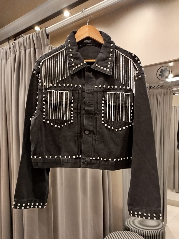 Se destaca por los apliques metálicos y las tiras con brillo aplicadas en canesú y bolsillos, que aportan movimiento, textura y un efecto visual impactante.La parte de la espalda es lisa completamente. Las mangas largas con detalles en los puños completan el diseño, manteniendo coherencia y personalidad en toda la prenda.