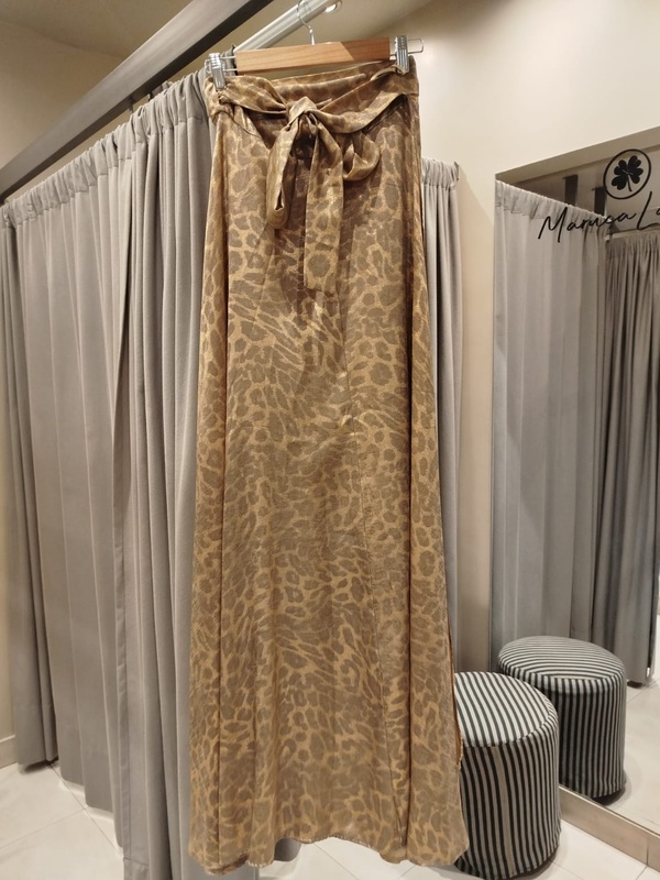 Falda larga de caída fluida con diseño envolvente que aporta movimiento y sofisticación. Presenta estampa animal print de trazo delicado, logrando un equilibrio entre carácter y elegancia. El lazo lateral permite ajustar la cintura con naturalidad y sumar un detalle femenino que estiliza la silueta.