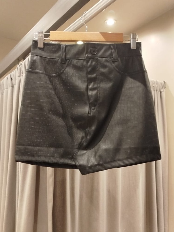 Pollera corta y entallada, confeccionada en eco-cuero con textura sutil, que aporta un acabado prolijo y moderno. Su diseño presenta cierre frontal con botón y bolsillos, logrando un equilibrio entre estructura y funcionalidad.