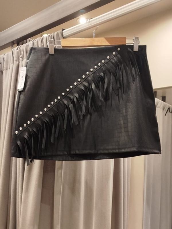 Pollera corta y estructurada, con una silueta definida que aporta presencia y actitud. El diseño se destaca por su detalle diagonal de tachas metálicas y flecos, que suma movimiento y un carácter marcado sin perder elegancia.