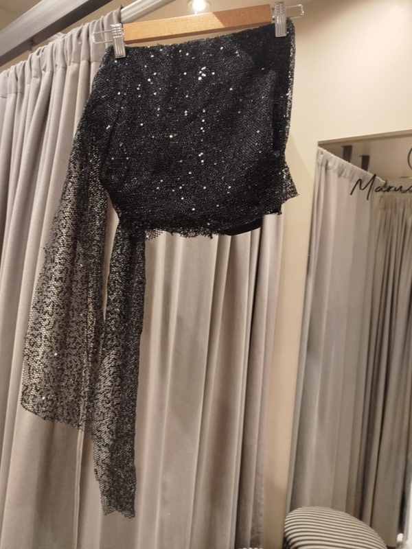 Falda corta con diseño protagonista, confeccionada en tejido íntegramente bordado con micro lentejuelas que aportan brillo sutil y textura sofisticada.
