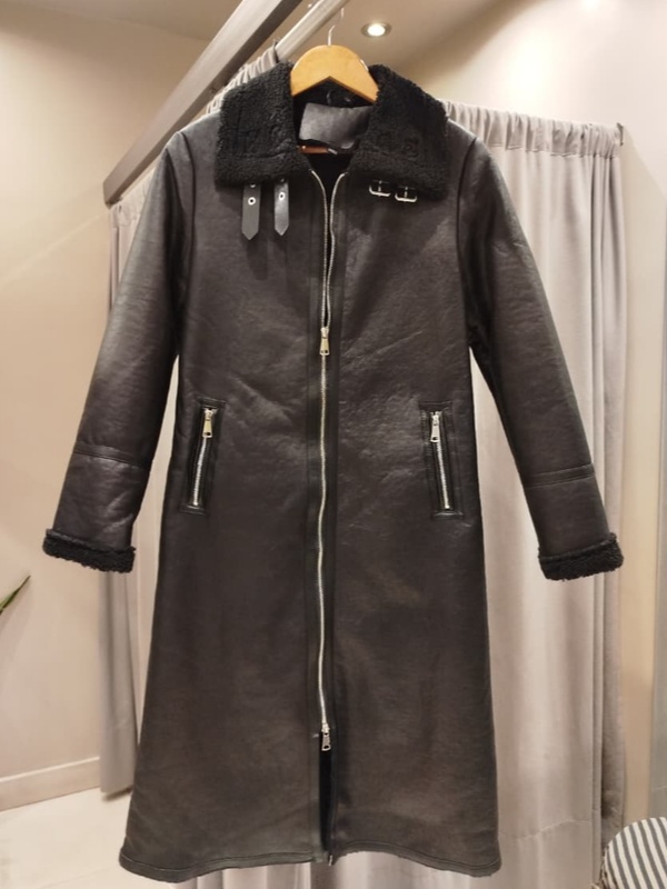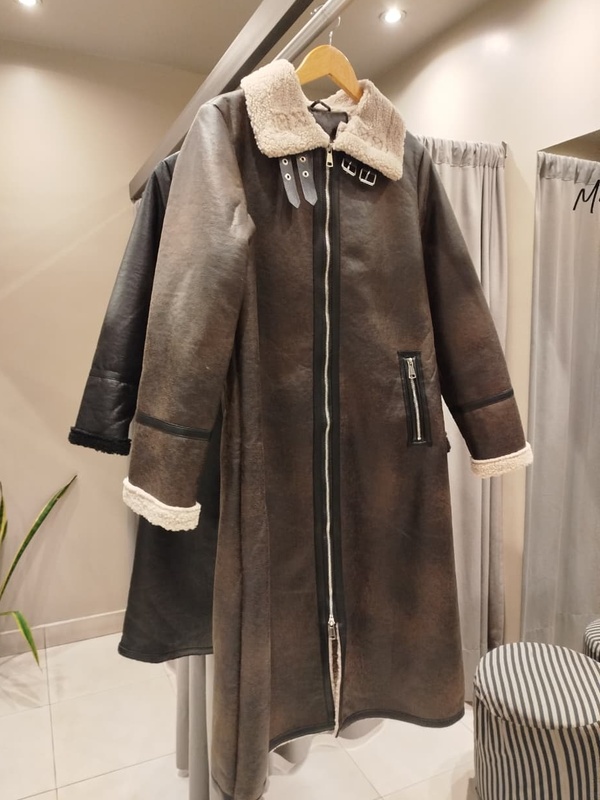 Este abrigo de eco-cuero de largo medio es una pieza pensada para destacar con elegancia en los días más fríos. Su interior afelpado aporta abrigo real, mientras que los detalles en cuello y puños suman una textura suave que eleva toda la prenda.